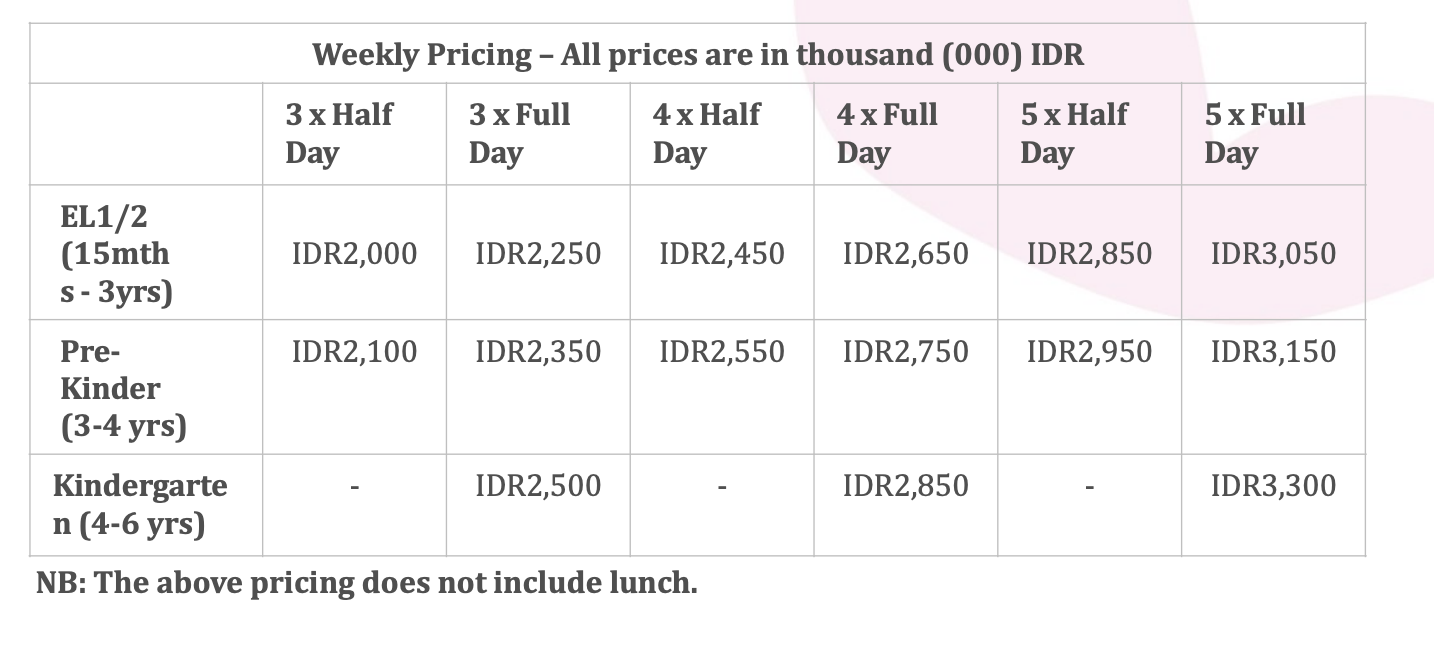 A non refundable enrolment fee of IDR3,000,000 per child (50% sibling discount applies to enrolment fee).